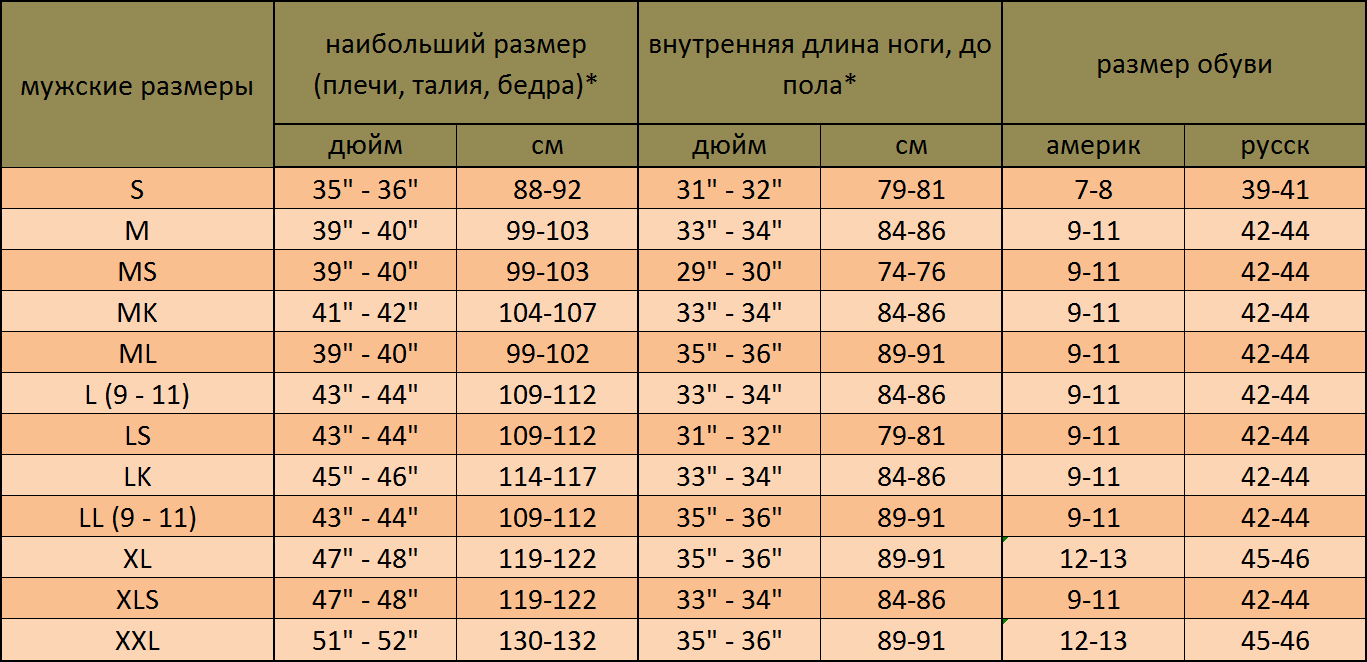 * - ИЗМЕРЕНИЯ ПРОВОДЯТСЯ ПО ТЕЛУ!